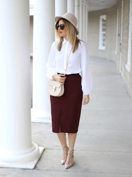 Одно из лучших цветовых трио — это бордо, бежевый и белый. Так, если вы хотите подчеркнуть свою женственность и элегантность, то подберите к юбке бежевый джемпер и такие же изящные туфли-лодочки на каблуке. Для работы — белая блузка и, чтобы не было скучно, бежевый удлиненный жилет.