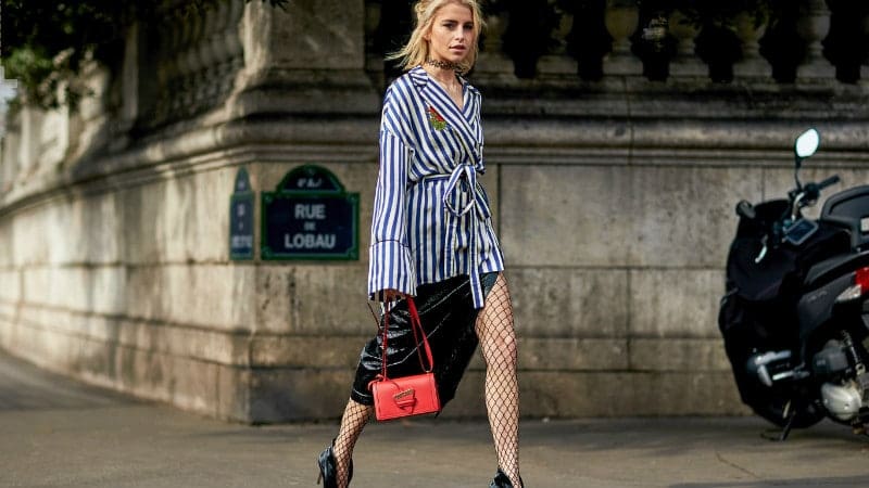 - Чтобы придать образу эстетику современного гранжа, сочетайте колготки в сетку с кожаными юбками или джинсовыми шортами.