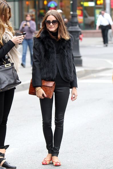 Икона стиля Оливия Палермо умудряется блистать в абсолютно монохромном черном наряде. Она надела свой меховой жилет с кожаными брюками, черным топом и блейзером. Цвета образу добавляют коралловые балетки и клатч глубокого коньячного цвета.