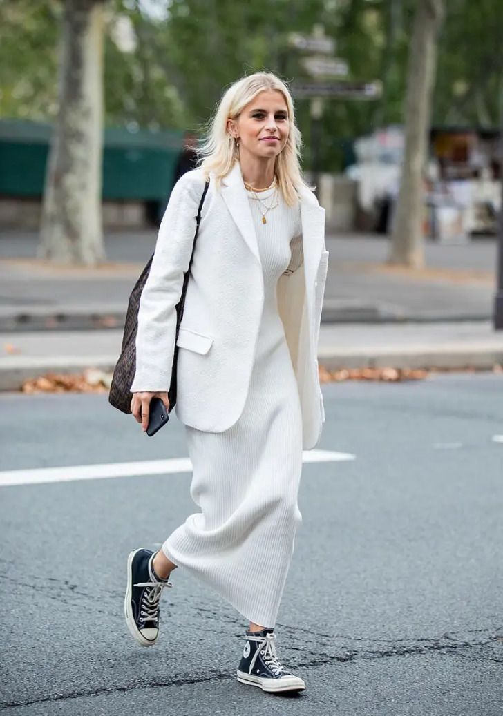 Да, не каждая осмелится на такой образ. Но, если все таки вы готовы рискнуть, дополните романтичное платье минималистичными кроссовками и блейзером.