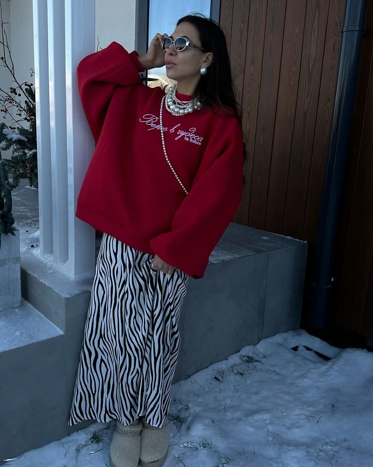 1. Жемчуг разных размеров и длин изящно сочетается со свитшотом и юбкой макси