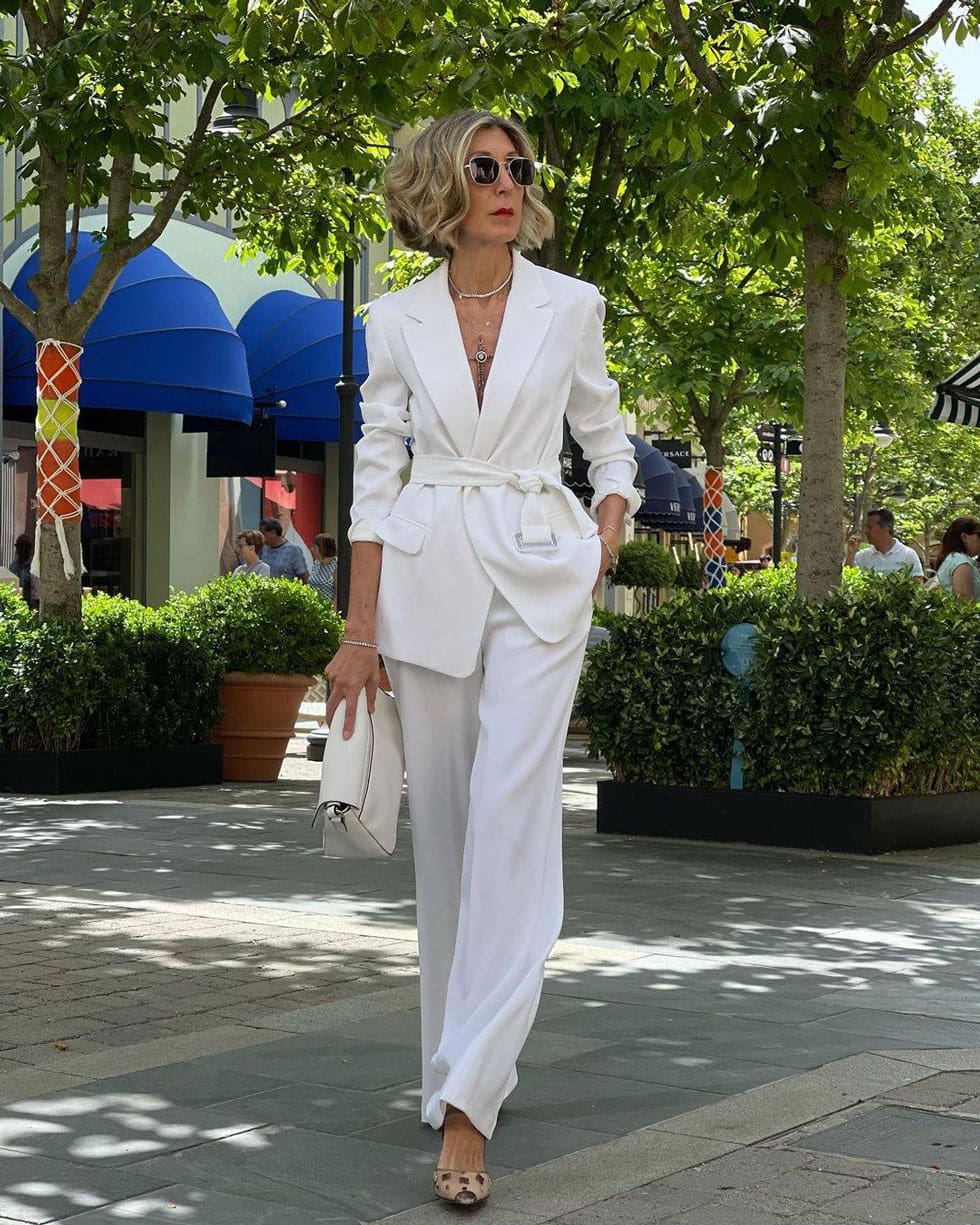 Женщина в белых свободных брюках и жакете с поясом