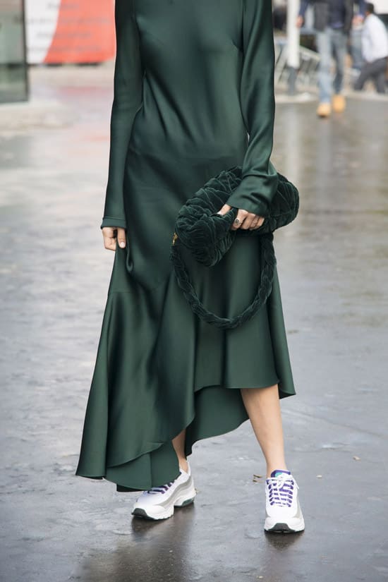 Выберите пару максимально простых кроссовок, таких как белые, и скомбинируйте их с длинным одноцветным платьем из блестящего шелка. Контраст действительно создаст эффект WOW.