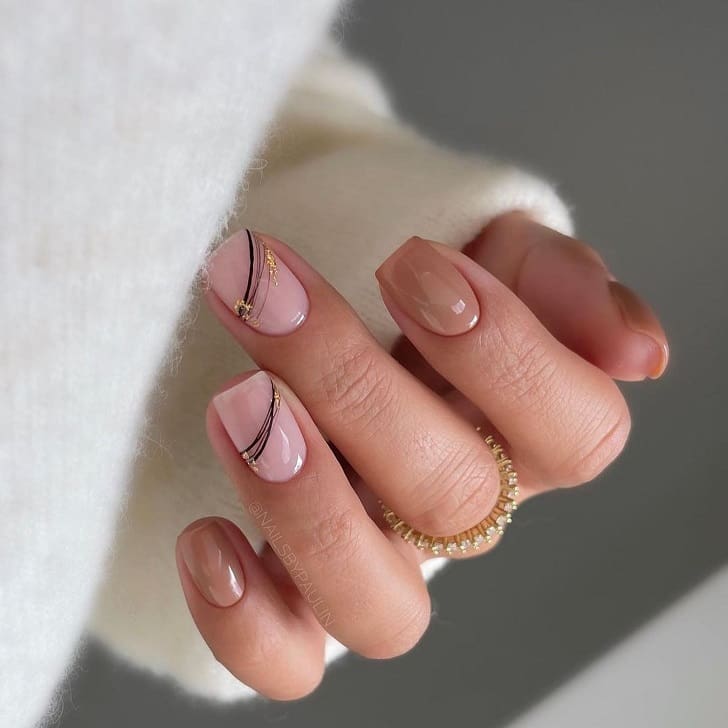 11. Молочный маникюр с линиями золотого белого и черного цветов