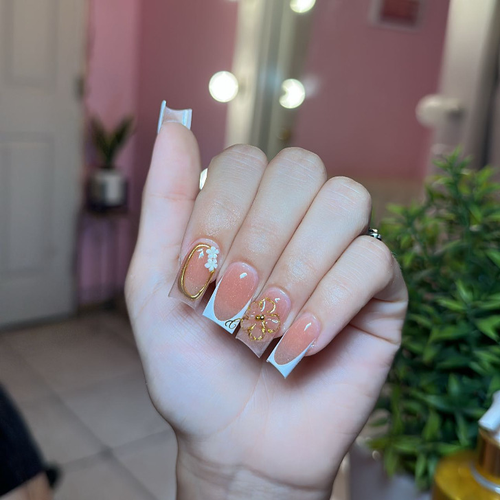 1. Благодаря микро цветочкам и золотой ромашке — этот дизайн отличный пример переходного маникюра