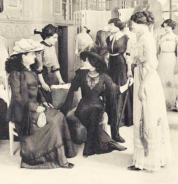 Вместе с продавцом женщины выбирали гардероб на следующие шесть месяцев: нижнее белье, домашнюю одежду, платья для прогулок, варианты чередования в одежде, костюмы для путешествий на поезде или в машине, вечерние наряды для праздного времяпрепровождения, наряды для особых случаев, таких как Аскот, свадьба, посещение театра. Список можно продолжать бесконечно, здесь все зависело от размера вашего кошелька!