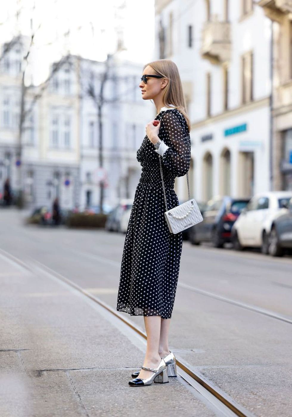 Минимализм? Это всегда отличный выбор. Платье миди в горошек + белые босоножки с квадратным носом = утонченный и шикарный образ. Цветная деталь для акцента — красная сумочка.